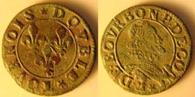 Au revers, on voit bien les 3 fleurs de lys et les titulatures DOUBLES TOURNOIS qui prennent l'ensemble du cercle (contrairement à de nombreux doubles tournois où la date est en haut à gauche).