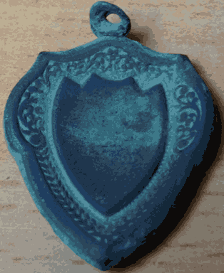 En fait il faut taper 'châtelaines de montre gousset' tu verras il y en a une grosse quantité sur google image. Pour le symbolisme j'en sais rien, ça servait de décoration, peut-être y avait-t-il un émail collé sur l'écusson ? Quant aux deux trous je pense qu'ils servaient à faire passer deux chainettes qui rejoignaient la clef de montre.
