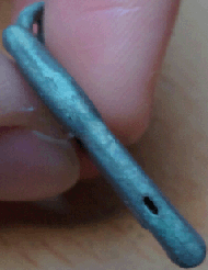 Trouvé cet objet en cuivre, creux, de 5cm de haut sur 3 de large. Deux faces identiques visiblement encastrées, avec un trou de chaque côté de la ligne de césure.