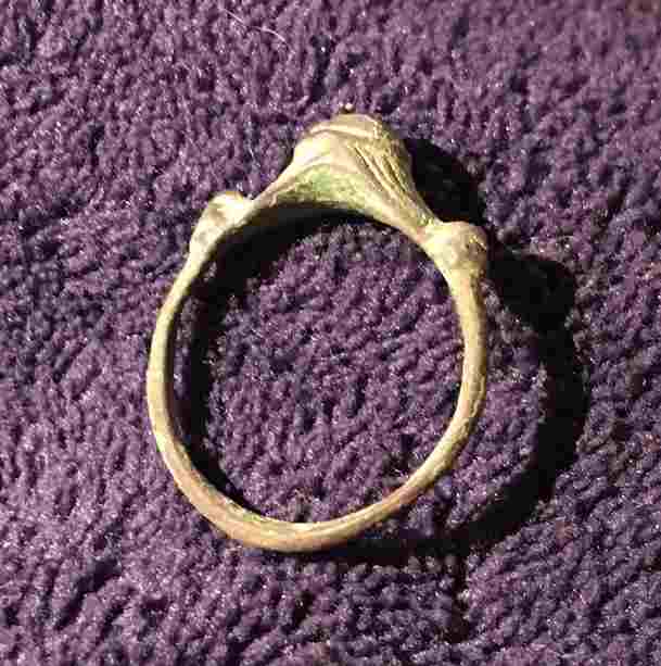 Il existe des bagues à épaulements dès l'époque romaine ( surtout des années 150 à 300 ) mais la tienne n'en a vraiment pas l'allure. Une chose est sure : elle est antérieure au XVII ème siècle ; j'aurais tendance à la donner pour du XIV-XV ème siècle.