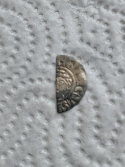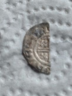 Si tu fais une recherche avec 'Penny Henry II short cross' tu devrais retrouver ce type monétaire .Il n'est pas rare de trouver ce type monétaire sous forme de deniers coupés en 2 morceaux .Ceci pour pallier au manque de petites monnaies (oboles).