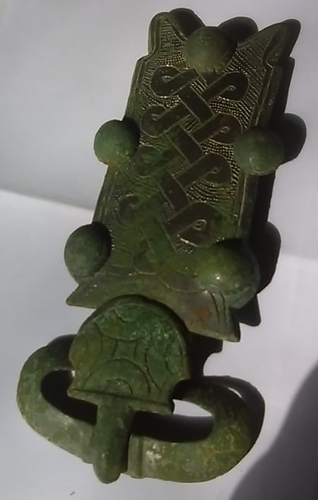 superbe boucle de ceinture, probablement 'damasquinée', la photo ne permet pas de l'affirmer, comportant un décor d'entrelacs, 7 ème siècle, des photos revers et profils seraient sympas.