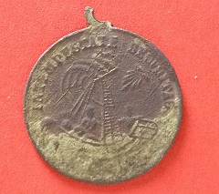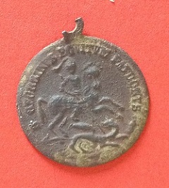 A l'avers Jésus et '2 disciples' en mer sur une nef, la voile au dessus symboliserait la protection ( divine ), et Saint Georges terrassant le dragon (démon) au revers