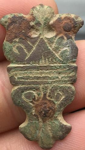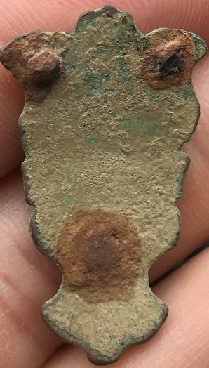 Trouvé dans un champ du 69, ce que je pense être une applique (de ceinture ?). Elle mesure 36mm de long par 21mm au plus large et pèse 5.15g.