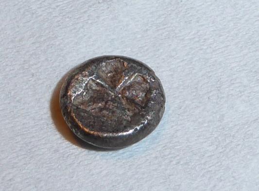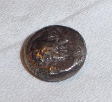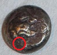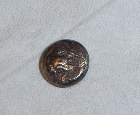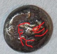 J'émettrai l'hypothèse de l'obole milesiaque 'au protomé de lion à gauche dévorant sa proie' on devine en bas la longue patte avant du félin ...voir à ce sujet les réf 60 et 61 de l'ouvrage de G. Maurel