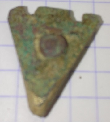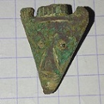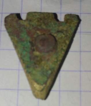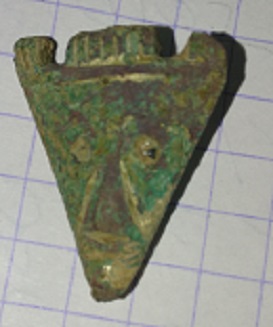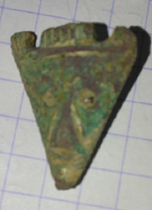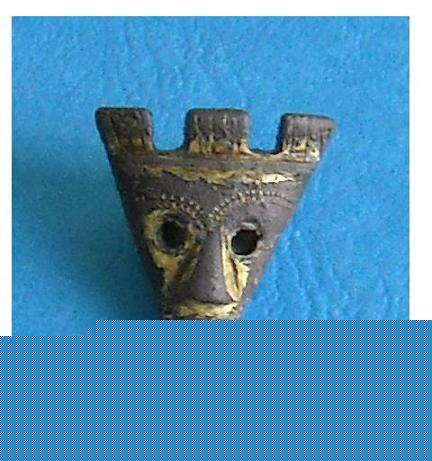 besoin d'identifier ce petit objet qu'au sortir de terre j'avais supposé être une vervelle, toutefois après en avoir enlevé la croute de terre est apparu un visage couronné avec des restes de dorure. La dimension en hauteur est de 2cm, la largeur au plus large 1,8cm à la couronne. Sur l'arrière le reste de la fixation qui me laisse à penser que ce devrait être un objet 'cloué' sur un vêtement par exemple tel un pin's d'époque plus lointaine...