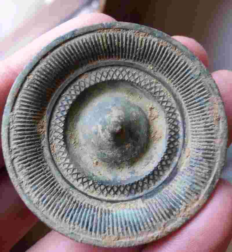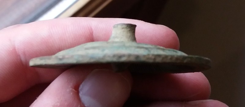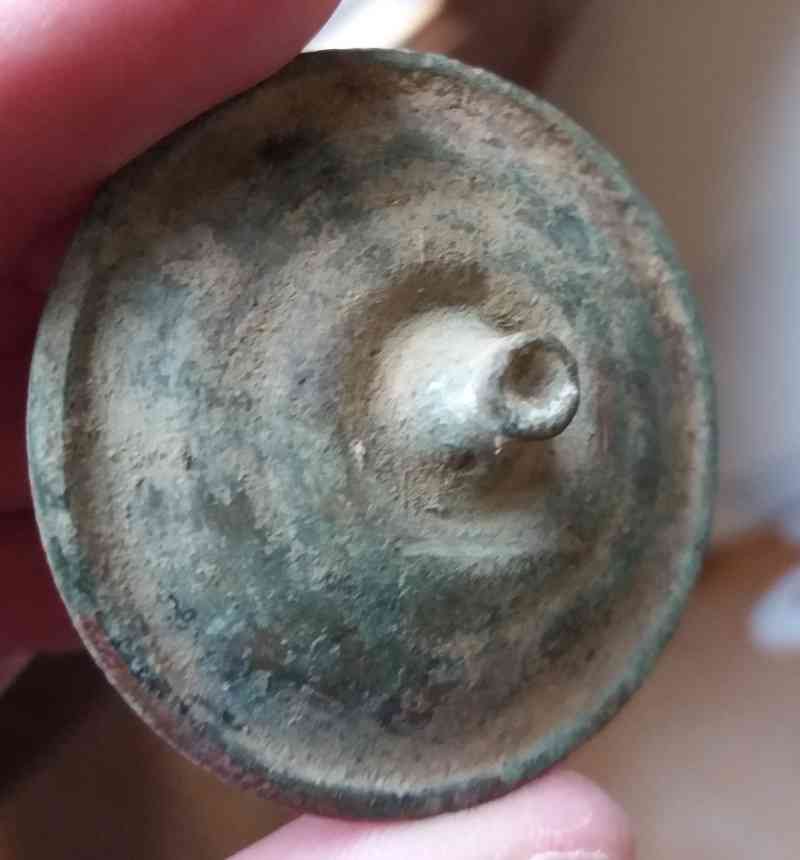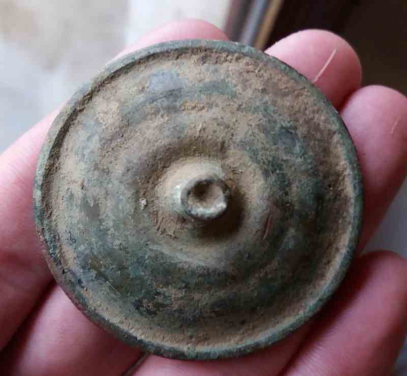 J'ai trouvé cet objet en forêt. Il mesure 45 mm et est constitué d'un téton en son centre avec des décorations. Sur l'envers une fixation/attache que je trouve assez moderne. Metal : cuivre selon moi.