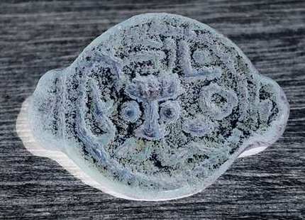 Les inscriptions sont purement ''décoratives'' donc les déchiffrer sera impossible. Comme le vieux barbu du dessus, j'y vois bien une tête.