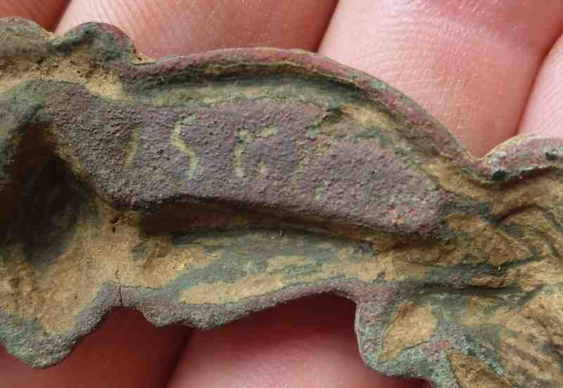 Au niveau des motifs je la pensait plutôt moderne (XIX-XXème) et puis en la frottant derrière j'ai découvert ce qui ressemble à une date : 1566 ou 1568. Comme je l'ai écris avant le style me surprend pour cette époque par contre, l'écriture est très proche de celle des mitres de couteaux datant de la même époque ( post 132217R0 ).