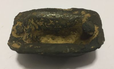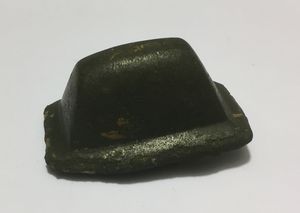 LĂ , je sĂšche... J'ai trouvĂ© cet objet en forĂȘt il y a quelques jours. Cela ressemble Ă du bronze, il mesure 38 mm de longueur, 25 mm de largeur, 20 mm de hauteur et pĂšse 31 gr. TrĂšs doux au toucher...
