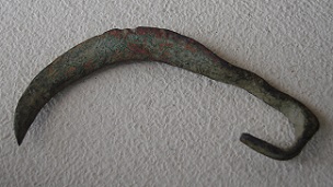 Sinon la forme me faisait penser à une lame de couteau serpette , mais le métal semble être du cuivre et élimine donc cette idée .