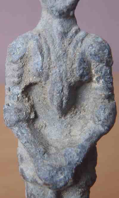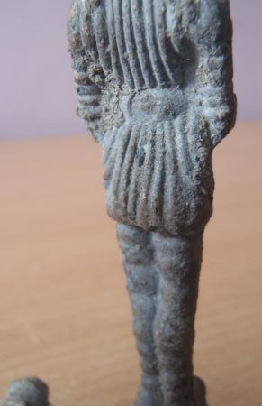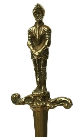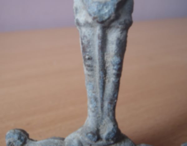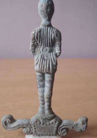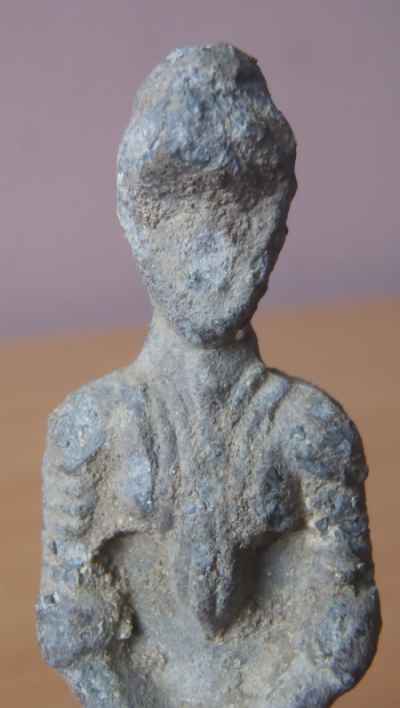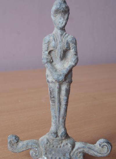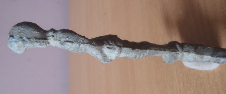 En enlevant ses haies, ma soeur a trouvé cet objet dans son jardin. Envrion 80 cm de profondeur. Il ressemble, à mon sens, un soldat en armure, se tenant droit et tenant dans ses deux mains le pommeau de son épee. Le socle semble travaillé.