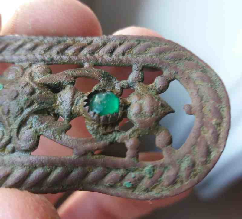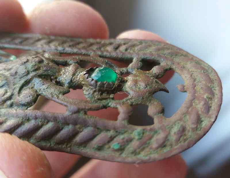 Mon autre doute est au niveau des deux pierres, elles brillent fort mais comme me l'a fait remarqué mon ami AlexelA, pourquoi mettre une Émeraude sur une broche en métal non noble (cuivre pour moi ici), on l'aurait plutôt vu sur de l'argent voir de l'Or. Pour autant, il s'agit bien de pierres mais lesquelles ? ...