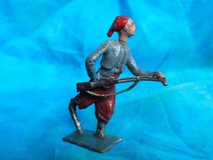 Salut. C'est un zouave reconnaissable à son sarouel, son gilet et son fez. Il a le fusil de cassé. Mais pas de jambe de bois car ce sont ses bandes molletières.