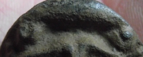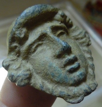 Peut-être qu'en cherchant à identifier le personnage représenté on pourra trouver une piste. On dirait qu'il porte une sorte de collier de barbe ou des cheveux qui lui descende le long du visage, il a un air un peu tristounet et il porte un truc sur la tête que je n'arrive pas à identifier! Une sorte de diadème?