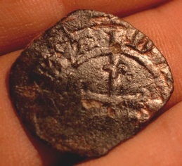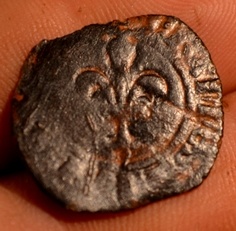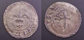 Voici un bas billon bien usé que j'aimerais identifié, j'y vois une fleur de lys d'un côté et de l'autre une croix dont une des branche coupe la légende (enfin je crois).