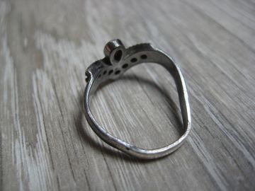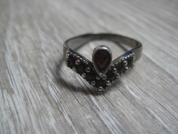 Je viens de trouver cette bague ( un peu tordu ) en argent ( qui comporte deux poinçons ) et avec des grenats ( il me semble, car c'est rouge foncé ).