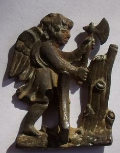 Tout d'abord merci à tous. une petite précision : après nettoyage plus poussé il apparaît au verso deux trous d'environ 1mm de diamètre...mais non débouchants.. Le premier au niveau de la tête de l'ange, le deuxième au niveau du pied droit. Le crochet n'a pas été moulé en même temps mais est serti