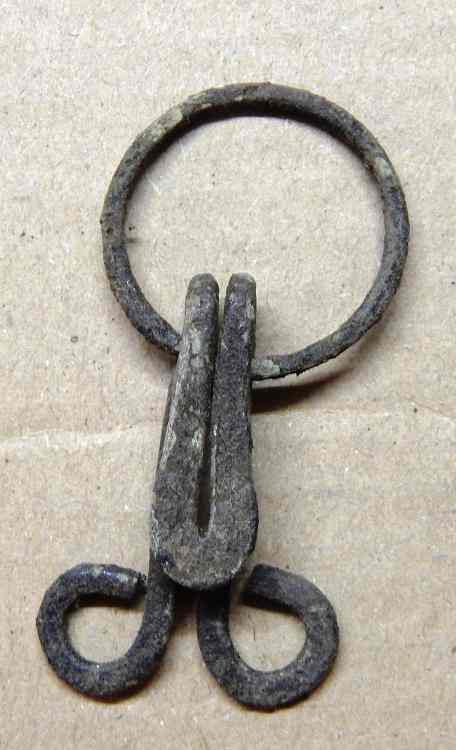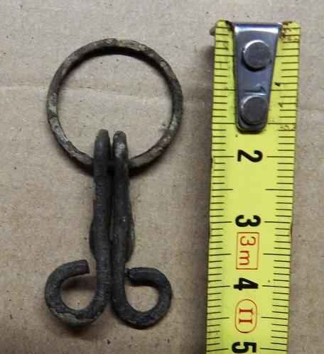 Petite sortie en forêt Vosgienne et j'ai sorti ce petit crochet : Apparemment il servait à tenir quelque chose dans son anneau ; Auriez vous des idées sur ce qu'il était ?