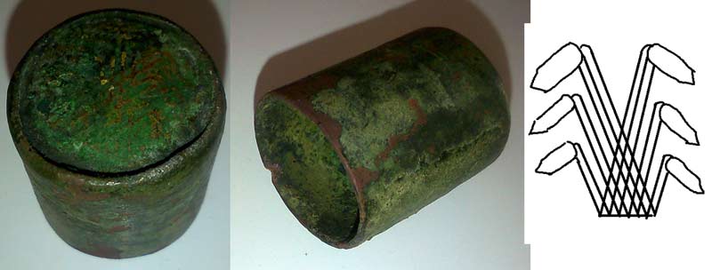 Petit tube de cuivre de 2 cm de diametre, 3 de long. avec un 'logo' sur le bout. ( que jai retranscrit avec mes talents artistiques)