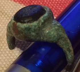 Bonjour à tous. Bague en bronze avec le cercle manquant en partie et une pierre qui semble être du verre, sans inscription ou gravure dessus. Merci pour vos impressions sur cet objet