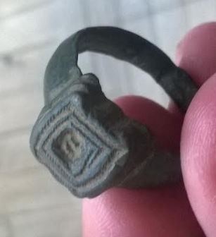 Après quelques semaines d'absence sur le forum pour cause de 'trop de travail' j'ai pu sortir une petite heure en fin de journée... A la clef, cette bague fortuitée en sous bois... Son motif pourrait être GR? Difficile à dire///