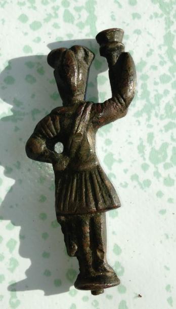RE Bonjour a tous ! Voila une figurine toujours trouver dans le nord de la France . Elle et en bronze elle mesure 6,05 cm d'hauteur son poids et de 67 g .on peu voir en bas qu'il devait y avoir un socle ! peut' être romain ou grecque on dirait un gardien mes pas sur .