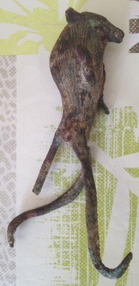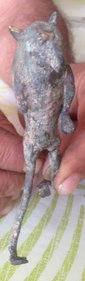 Je ne dis pas que ton objet est de même provenance, mais il s'en rapproche pas mal, même si le tien semble fondu et sans doute bien plus ancien, mais vu la position de ce qu'il reste de son bras gauche, il se pourrait bien qu'au temps de sa gloire il ait tenu, lui aussi un genre de plateau soudé plutôt que riveté. Peut-être un genre de brûle -parfum ou brûle-encens.