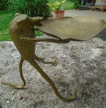 ton objet me rappelle pas mal un autre qui traîne dans ma famille depuis les années trente et qui avait été rapporté du Cameroun par ma grand-tante. Il s'agit d'un cendrier représentant un singe (babouin?) portant un plateau et en appui sur ses deux jambes et sa queue. L'objet est en laiton ou en bronzaille (genre robinet).