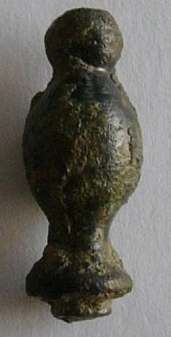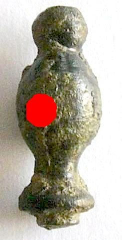 voici un objet en bronze verdâtre de 3 cm de hauteur et 1 cm au plus large