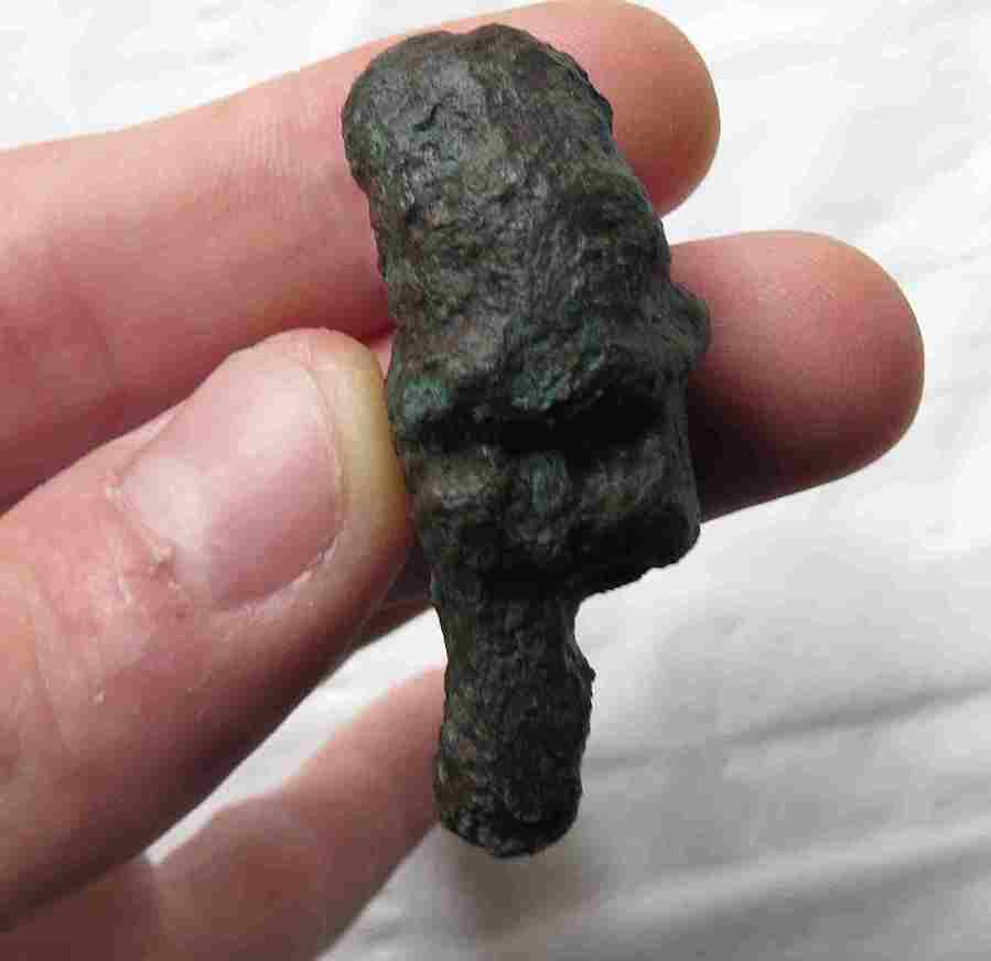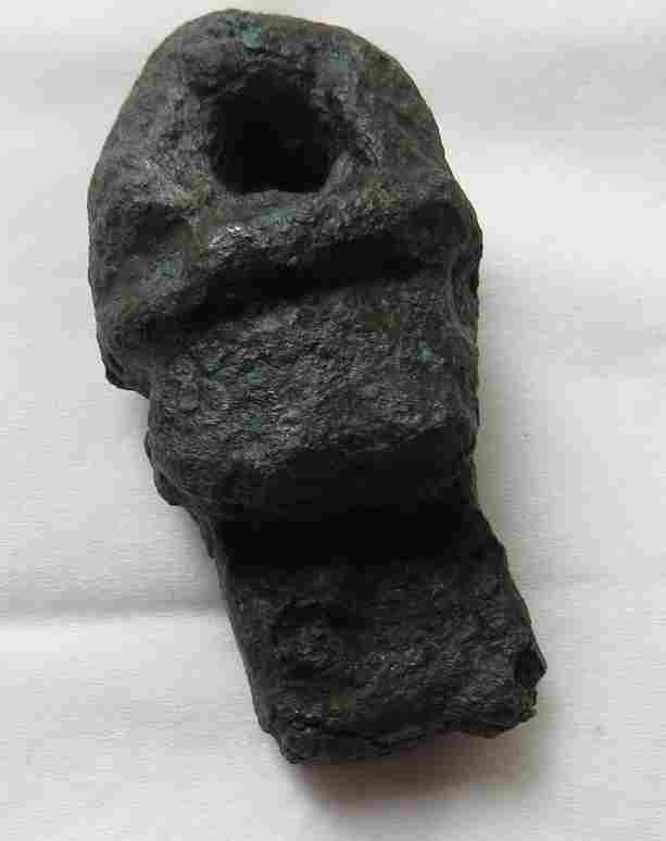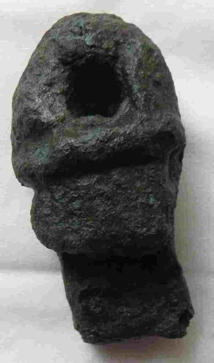 Ma seule hypothèse pour l'instant : peut-être une sorte de gond, car le petit trou pouvait peut-être permettre le pivotement d'un axe, et la partie avec le décalage était peut-être sceller dans un matériaux comme le bois.