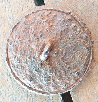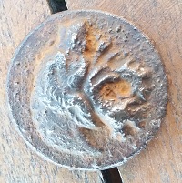 trouvé ce bouton en fer 25 mm epais 3 mm sans l'attache avec dessin en fort relief, dessin incompréhensible, je sais même pas dans quel sens regarder:)
