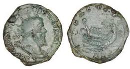 Vu l'épaisseur et ce qui reste du revers, je pencherai pour un sesterce de Postume avec comme revers la galère comme celui-ci :