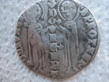 C'est un Soldo de Louis V de Bavière empereur et roi d'Italie . Ce qui est écrit entre les 2 saints est LVDOVIC IPT .