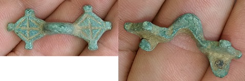 Encore une fibule symétrique ansée, avec protubérances ,merovingienne à plateaux losangiques et à décor cruciforme