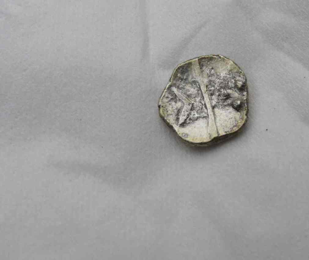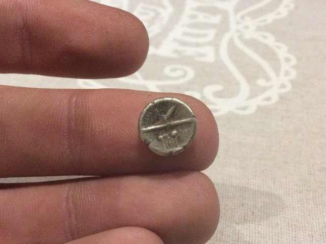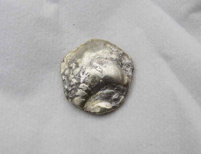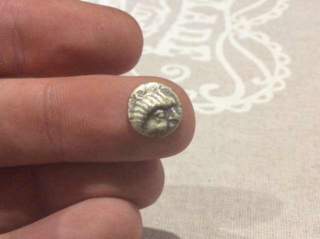 Voici une superbe petite monnaie trouvée en forêt ce week-end dans 15 cm sur un petit son. Je pense à de l’électrum, son poids est de 1,6 grs pour un diamètre de , à sa sortie de terre elle possédait une gangue de terre et/ou d'oxydation ? très tenace!