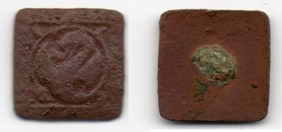 Issue du même labour que mon bouton marine, ce petit objet en cuivre 12 mm de coté avec un motif où je pense voir un dragon crachant flamme. j'hésite donc entre clou ou paillette ..