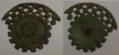 Issue du même labour que ma boucle ce sympathique reste de déco en cuivre d'un diamètre de 40 mm à l'origine...Épaisseur très fine je dirai 0,5 mm.