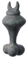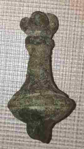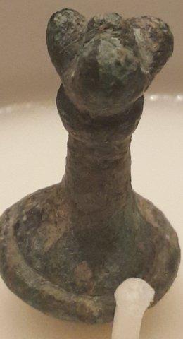 un artefact pour une fois, donc c'est bien patiné, j'ai pensé à un manche d'un stylet avec la lame qui serais cassée, au début, je pensais que c'était une tête d'ours mais au grattage non la partie sommitale me semble juste une déco simple.
