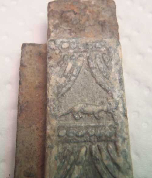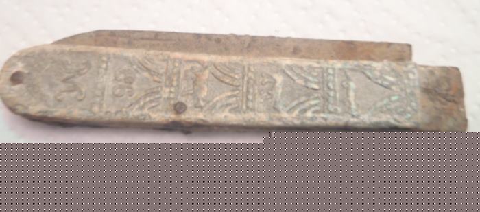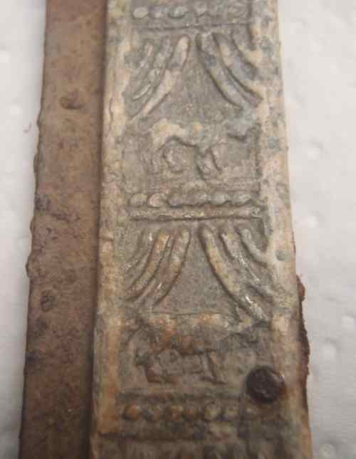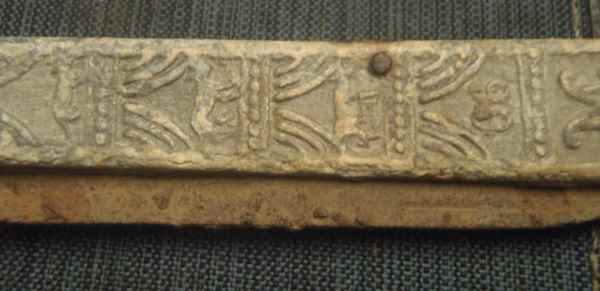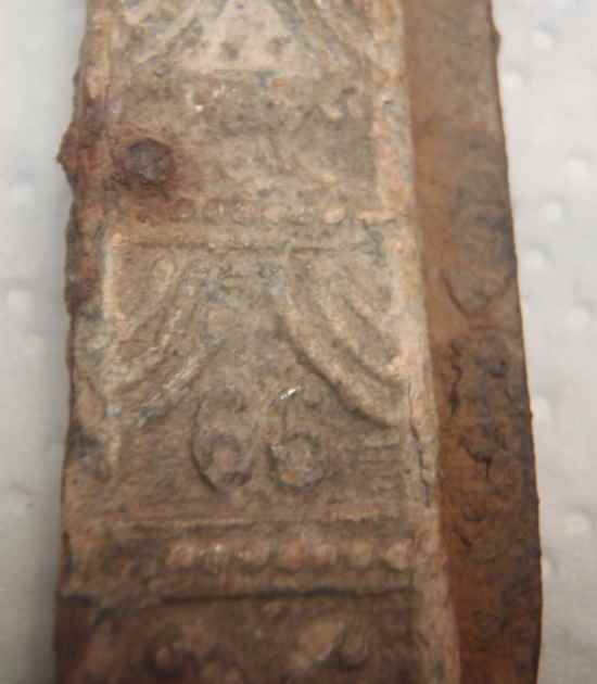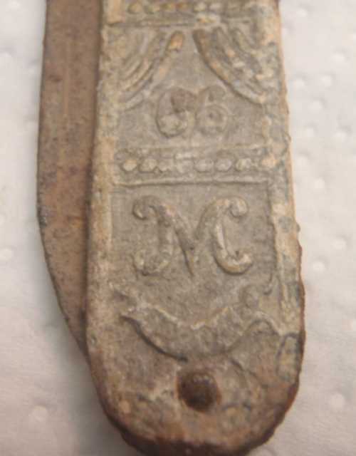 On aperçoit le chiffre 66, la lettre M ainsi quue des animaux : couteaux de chasseurs ?