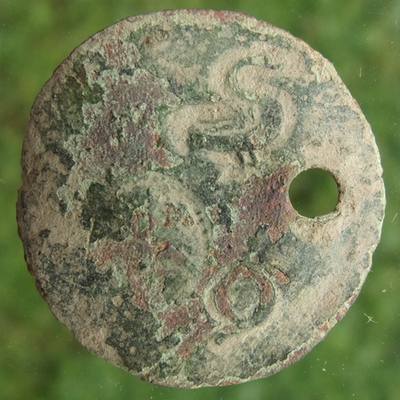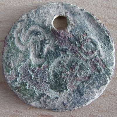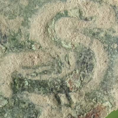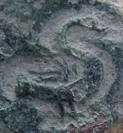 Bien content de la voir cette médaille, je ne pense pas que ça soit un O car je crois qu'il y a une queue sur la gauche un peu comme un Q mais retourné. Pour l'hippocampe, gros doute aussi car je lui vois deux pattes donc plus un sygne effectivement. Bon ok, ça fait pas avancer l'ID, mais c'est juste mon avis. Peut-être un nettoyage un peu plus poussé, mais cela me semble difficile.