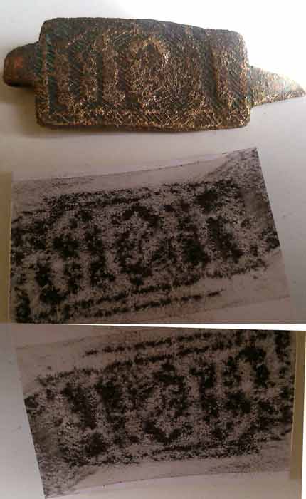 J'ai fait un petit frottage crayon pour mieux lire les inscriptions. Meme si je suis incapable de dire dans quel sens il faut lire, se se sont des lettres ou chiffres, ni meme la langue