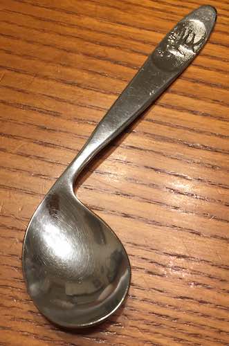 J'ai une cuillère qui a la même forme que la tienne, utilisée successivement par mes trois enfants et appelée chez moi la 'cuillère tordue'. Tes photos m'y ont immédiatement fait penser. Je ne suis malheureusement pas en mesure de faire une photo maintenant.