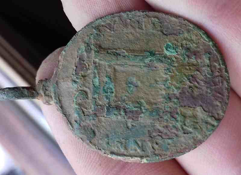 Fraîchement revenu d'une semaine de vacances en Dordogne chez l'ami AlexelA et nouveau possesseur d'un joli DEUS tout neuf (le Euroace ne me manque pas ), je me suis fait une petite sortie de 2h ce matin. Seule et unique trouvaille cette grosse médaille religieuse (bélière inversée). D'un côté je vois Marie en train de prier (mais pas de titulatures car trop usées) et de l'autre une sorte d'autel (??) avec quelque reste de titulature : NNV d'un côté et VBI de l'autre (latin pour moi).