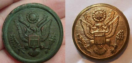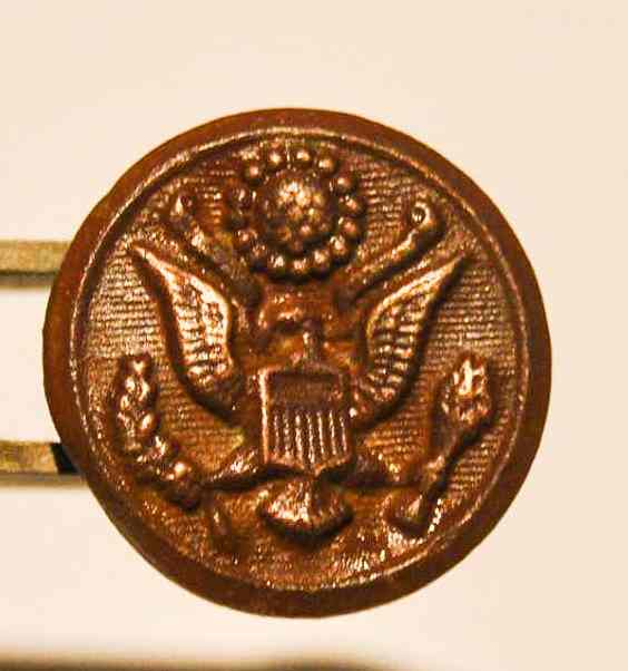 Bouton des services généraux 1902-1930 environ. on le retrouve en WW1 et WW2, ill s'agit d'un bouton américain dont l'emblème national est le pygargue à tête blanche il figure toujours tenant une branche d'olivier et des flèches surmonté d'étoiles, on peut toujours voir cet emblème sur les documents officiels depuis 1782. Au moment de l’élaboration du sceau des États-Unis, Pierre Eugène du Simitière, qui participait au projet proposa d’ajouter une devise au blason : “ E Pluribus Unum ” peut se traduire par « Un à partir de plusieurs » ou, dans une traduction plus directe, « De plusieurs, un ».dans la bannière juste au dessus de l'aigle, le 15 septembre 1789.