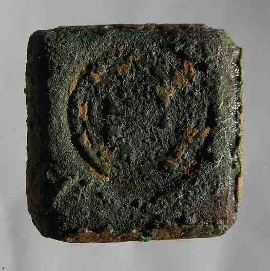 J'ai trouvé hier dans les bois un carré de cuivre. Ce n'est qu'au nettoyage que j'ai vu qu'il y avait eu un motif un cercle et probablement des inscriptions ou motifs qui sont maintenant illisibles