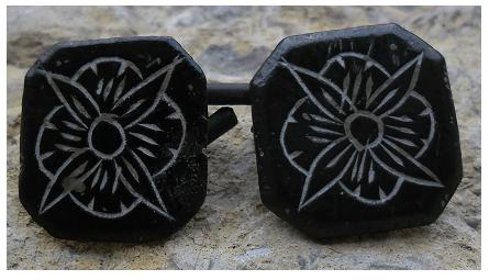 Même à la Révolution, autrement dit au tournant du XVIII ème et du XIX ème siècle, les boutons de cape ont encore cette forme octogonale, cette bordure unique incisée et non moulée, ces dimensions massives du plateau et de l'anneau, et ce caractère tout-à -fait artisanal :