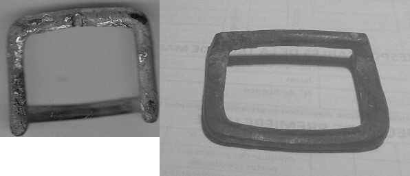 Du même avis que Bidouille. Ces boucles à traverse déportée (? La traverse n'est-elle pas cette barre où repose l'ardillon ??) sont des boucles agricoles ou de harnachement permettant le passage de grosses sangles. Elles sont modernes XIXe / XXe. J'en ai trouvé une double avec ses cuirs.