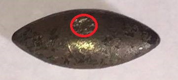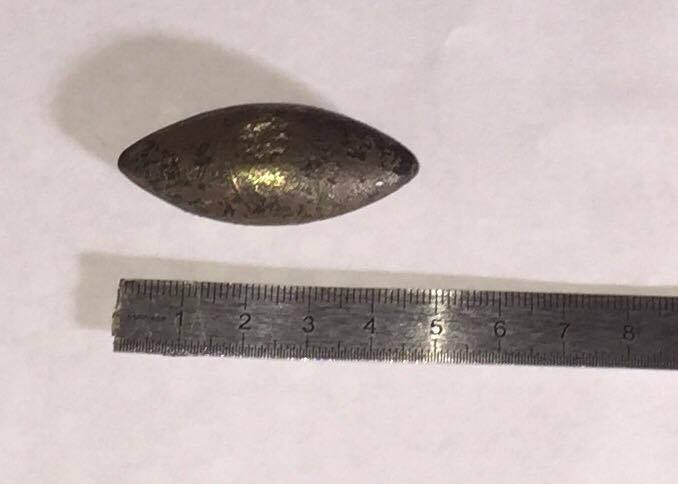 Voici une balle de fronde que j'avais trouvé, je rappelle son poids 44 grammes, 20 m/m de large et 10 m/m d'épaisseur