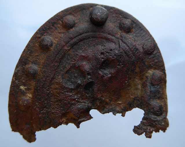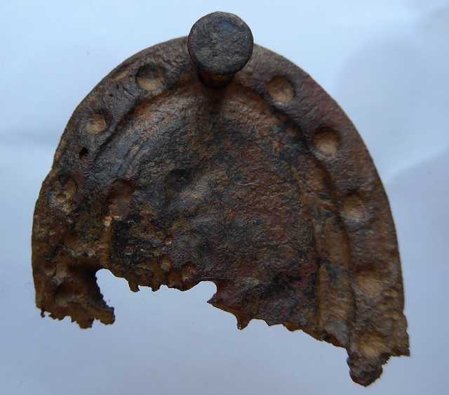 Le pourtour est orné de petits ronds en creux d'un côté, en bosses de l'autre, faisant ressembler à un fer à cheval. Le haut est percé d'un rivet à tête plate en cuivre.